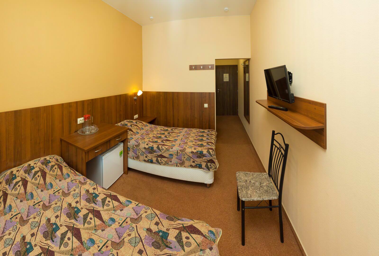 Площадь номера - 10 кв.м. 2 осн. места. 1 доп. место. Балкон. Мебель: кровати односпальные (2), прикроватные тумбочки, шкаф. Оборудование: мини-холодильник, телевизор. Санузел. Сервис: смена полотенец, смена постельного белья, уборка номера.