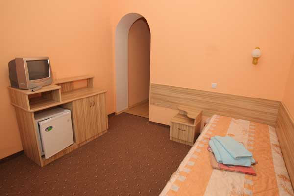 Площадь номера - 12 кв.м. 1 осн. место. Балкон. Мебель: вешалка, зеркало, кровать односпальная, прикроватная тумбочка, шкаф. Оборудование: мини-холодильник, телевизор. Санузел. Сервис: смена полотенец, смена постельного белья, уборка номера.