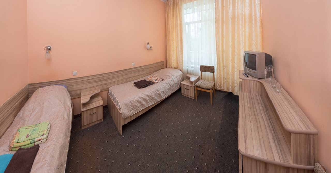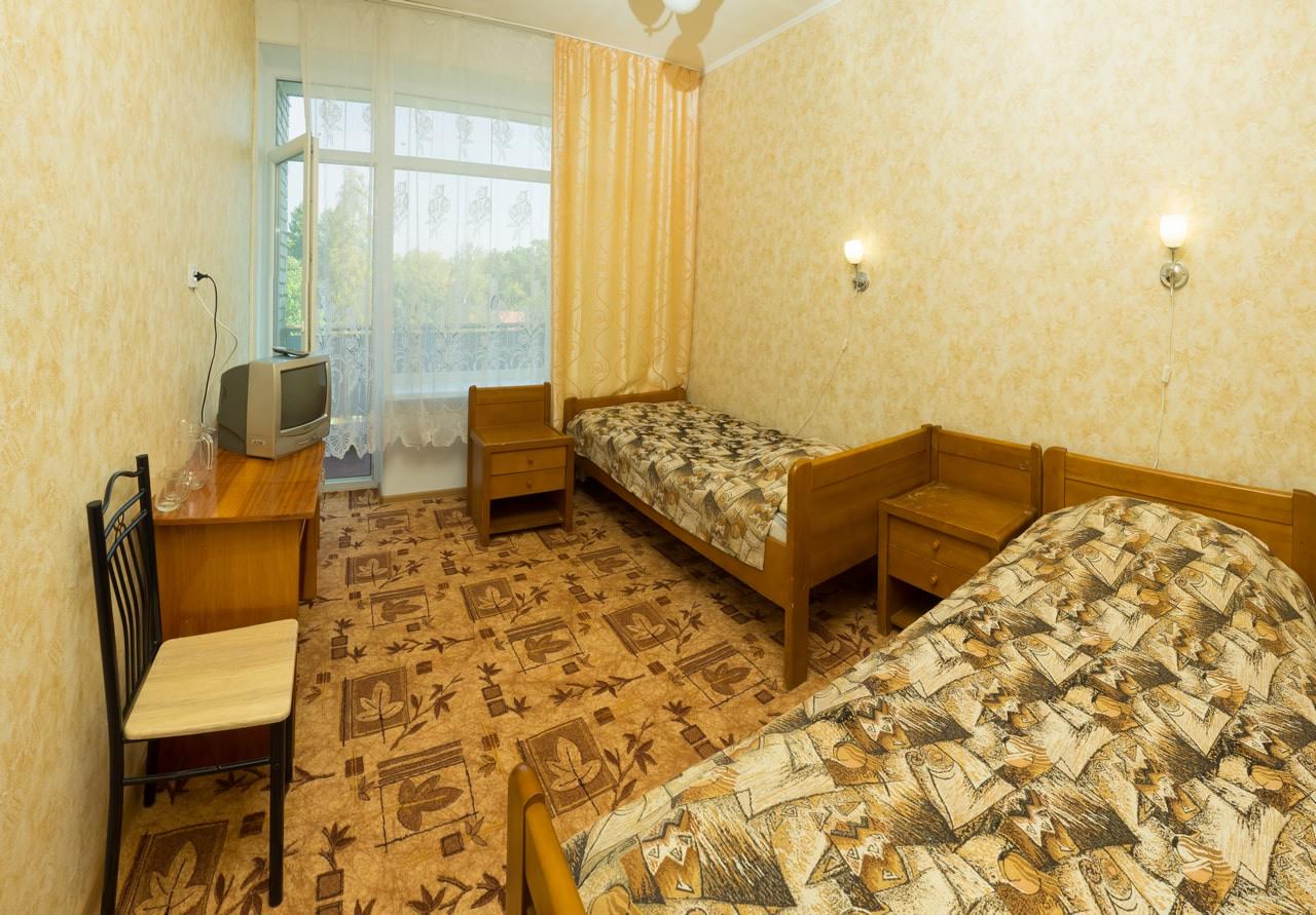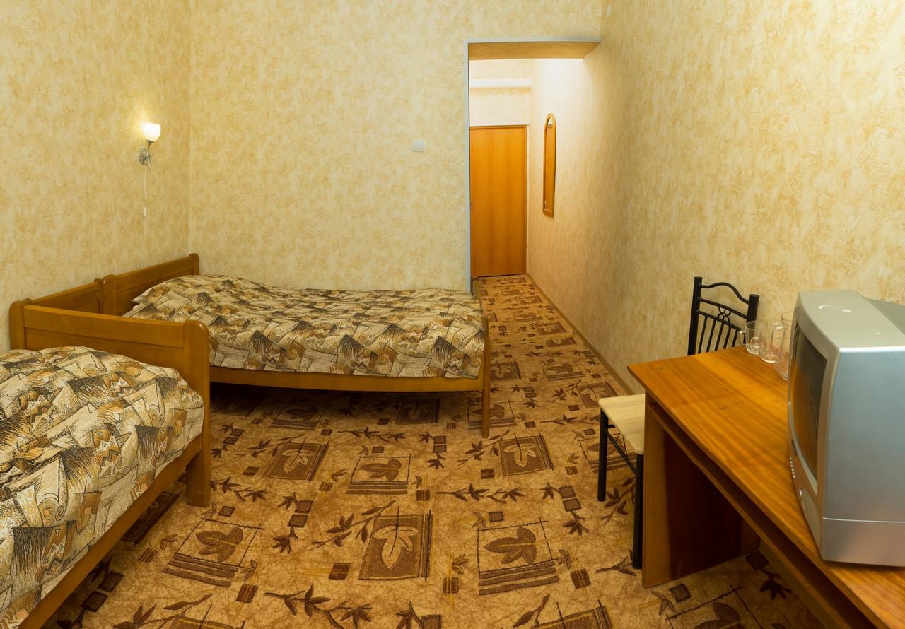 Площадь номера - 12 кв.м. 2 осн. места. 1 доп. место. Балкон. Мебель: вешалка, зеркало, кровати односпальные, прикроватные тумбочки, шкаф. Оборудование: мини-холодильник, телевизор. Санузел. Сервис: смена полотенец, смена постельного белья, уборка номера.